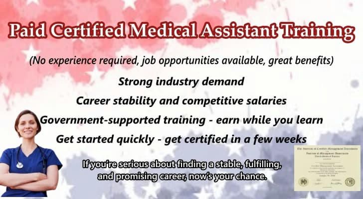 Looking for a fast and reliable career path in healthcare? Paid Medical Assistant programs can be completed in as little as 9-12 weeks. These state-approved courses require no prior experience and let you earn while you learn . Students may also qualify for government grants, scholarships, and stipends—no student loans needed to start your new career.This is great news for anyone wanting to work in healthcare!